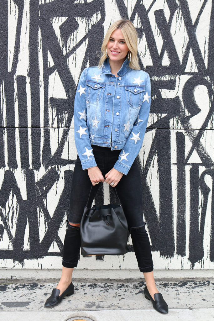Someone once told me that “housewives”aren’t suppose to wear jean jackets. I am here to prove them wrong!! Jean on jean all day, everyday! I love finding fun new twists on the old faithful jean jacket. Why not make a statement with your jacket this season ?!? By the way, I’m still loving this bucket bag! It’s great quality and I use it all the time, well worth the price! (Can you believe it’s less than $200?!?).