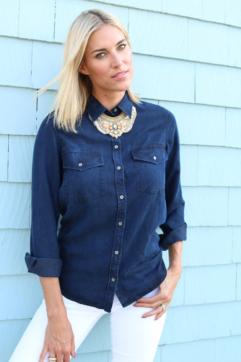 There is something so fantastic about a statement necklace! Take it from me when I say that jewelry is the key to completing an outfit. For example, take a look at what I’m wearing… a dark wash denim shirt and white skinny jeans. The bib necklace is what makes this outfit cohesive and bold! Dress this necklace up, dress it down and definitely wear it all around!